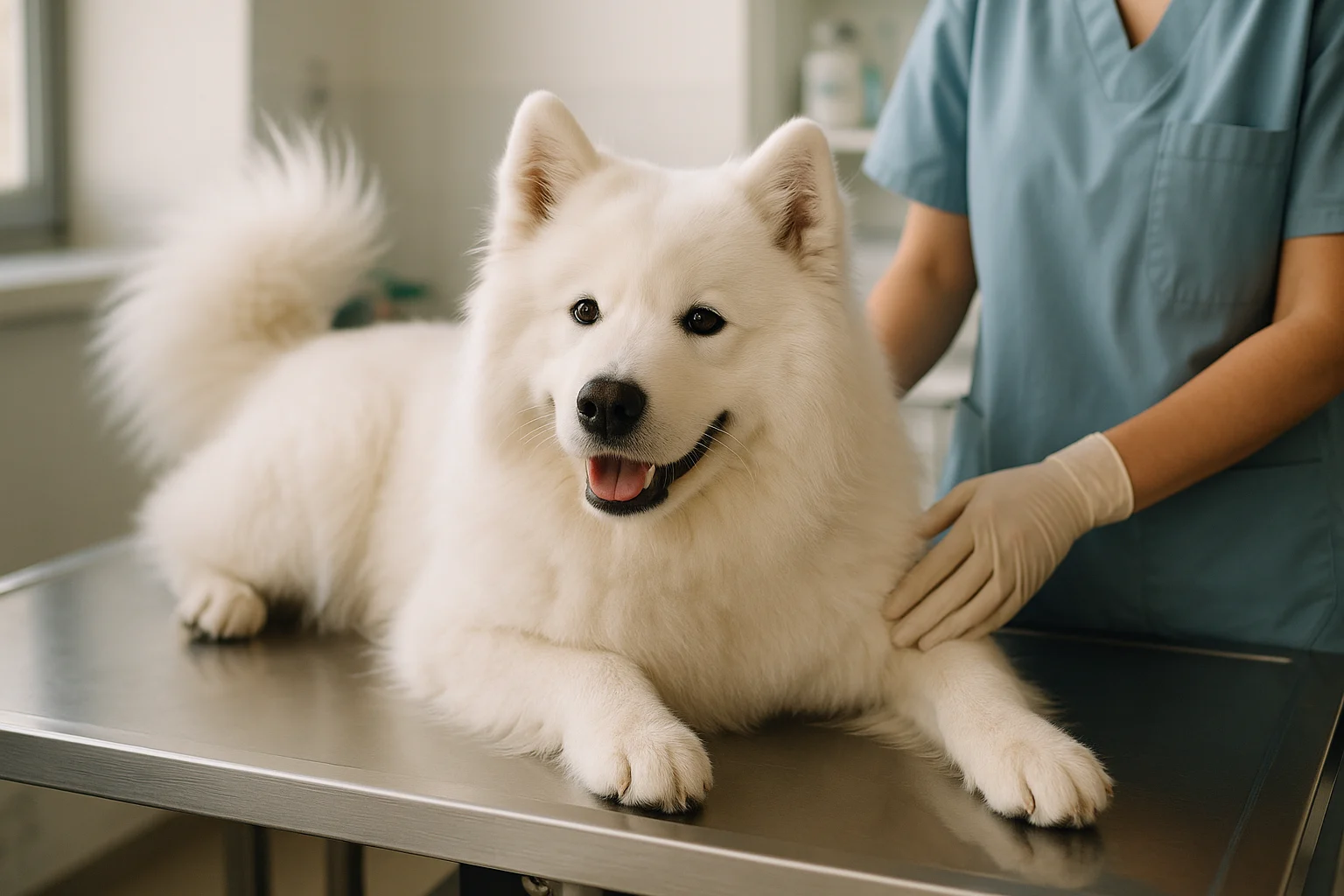 Visite de contrôle au moins annuelle ; à partir de 7–8 ans, un bilan semestriel avec analyses sanguines de routine aide à dépister précocement les troubles liés à l’âge. Chez le Samoyéde, un examen oculaire régulier est pertinent, et un contrôle des hanches par radiographie est utile avant toute reproduction. Surveillez le poids, l’haleine, la qualité du poil et la mobilité.